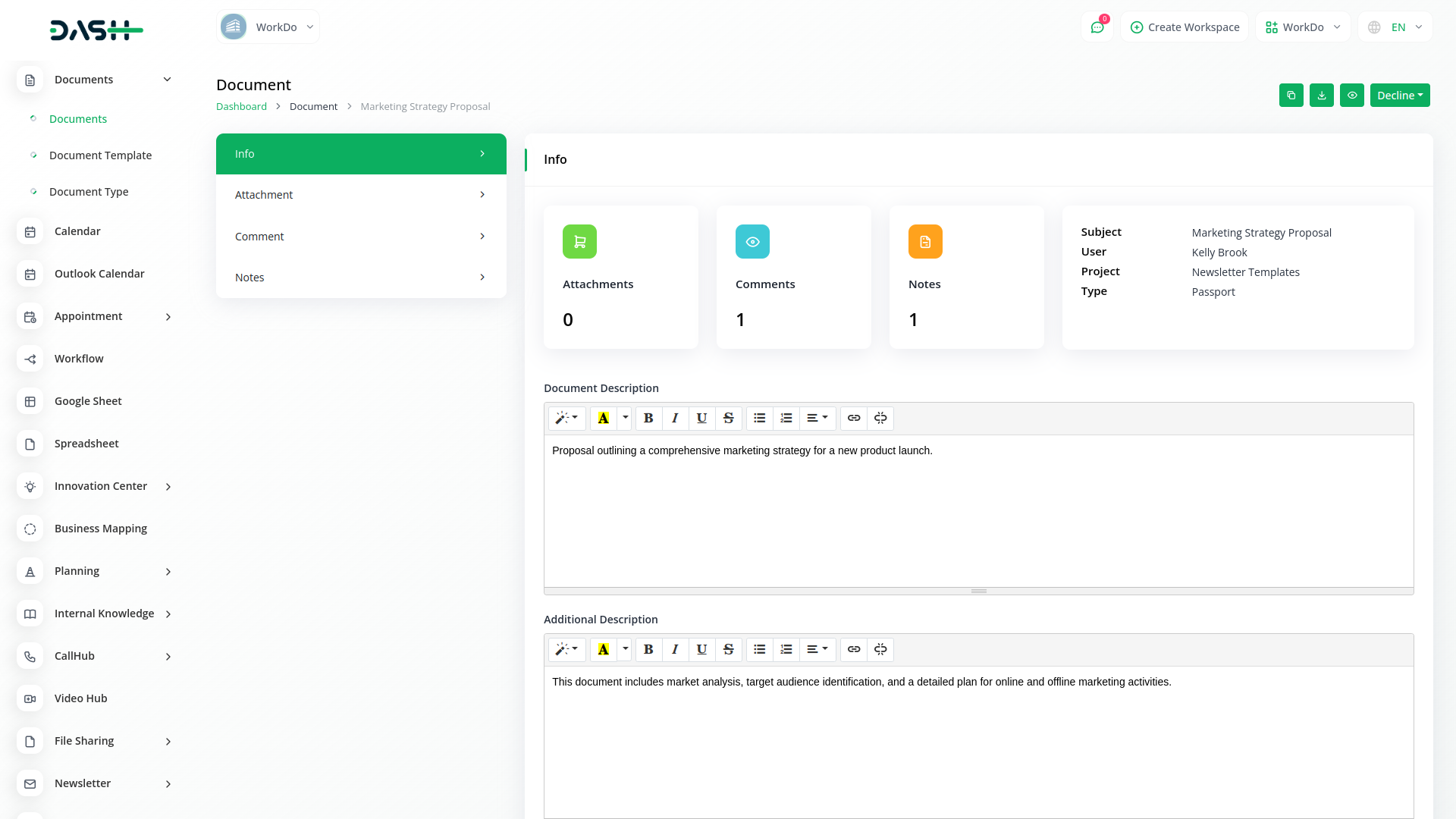 Experience the seamless integration of Dash SaaS's Documents Integration with the Project Module, revolutionizing project document management. Effortlessly link project-related documents, streamline collaboration, and enhance transparency within your project teams. With centralized document organization and project-centric features, empower your teams to achieve greater productivity and efficiency in project execution.