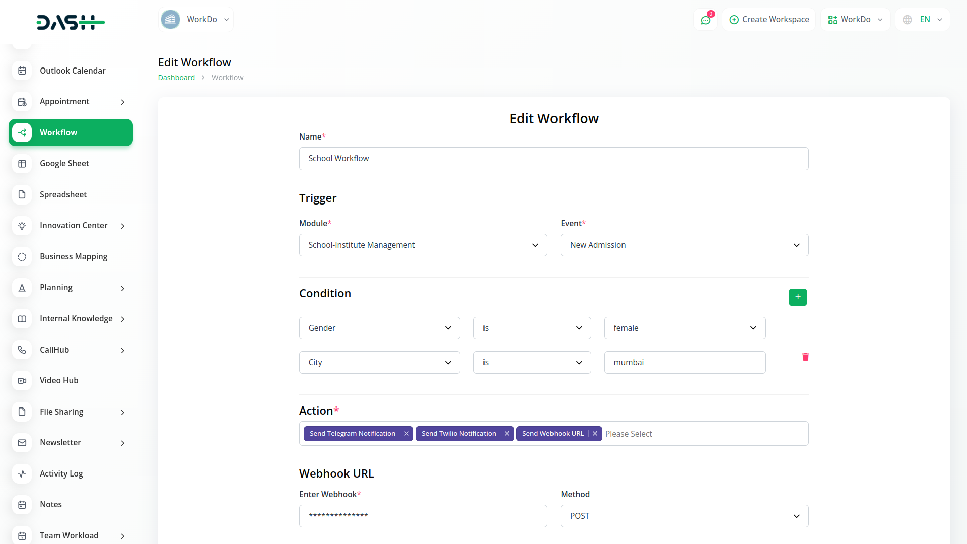 Workflow automation triggers notifications (email, Slack, Telegram, Twitter) for new invoices, user leads, projects. It monitors status and sends personalized alerts. Streamlines communication and updates for efficient processes.