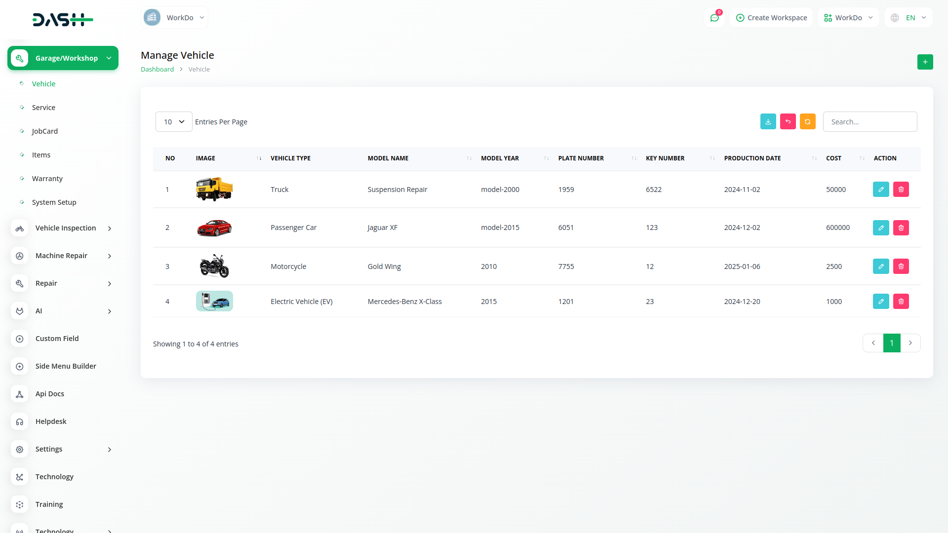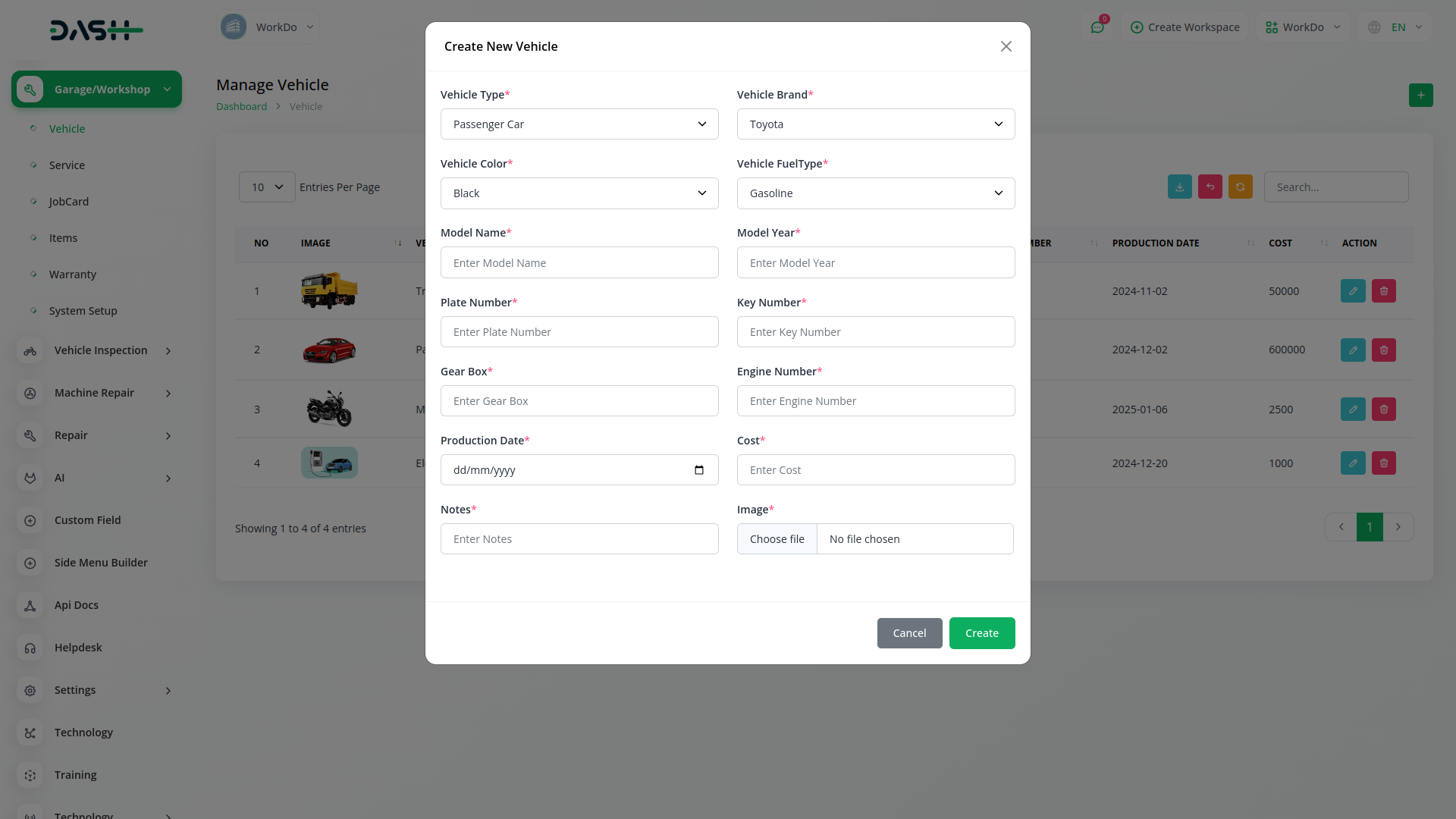 Garage/workshop management system streamlines operations by allowing seamless creation and tracking of vehicles and services. Effortlessly input vehicle specifics like make, model, and year for informed decisions. Define services with names, descriptions, and costs, aiding transparent cost estimation. This unified system catalogues services, empowering efficient workshop management and elevating customer satisfaction.
