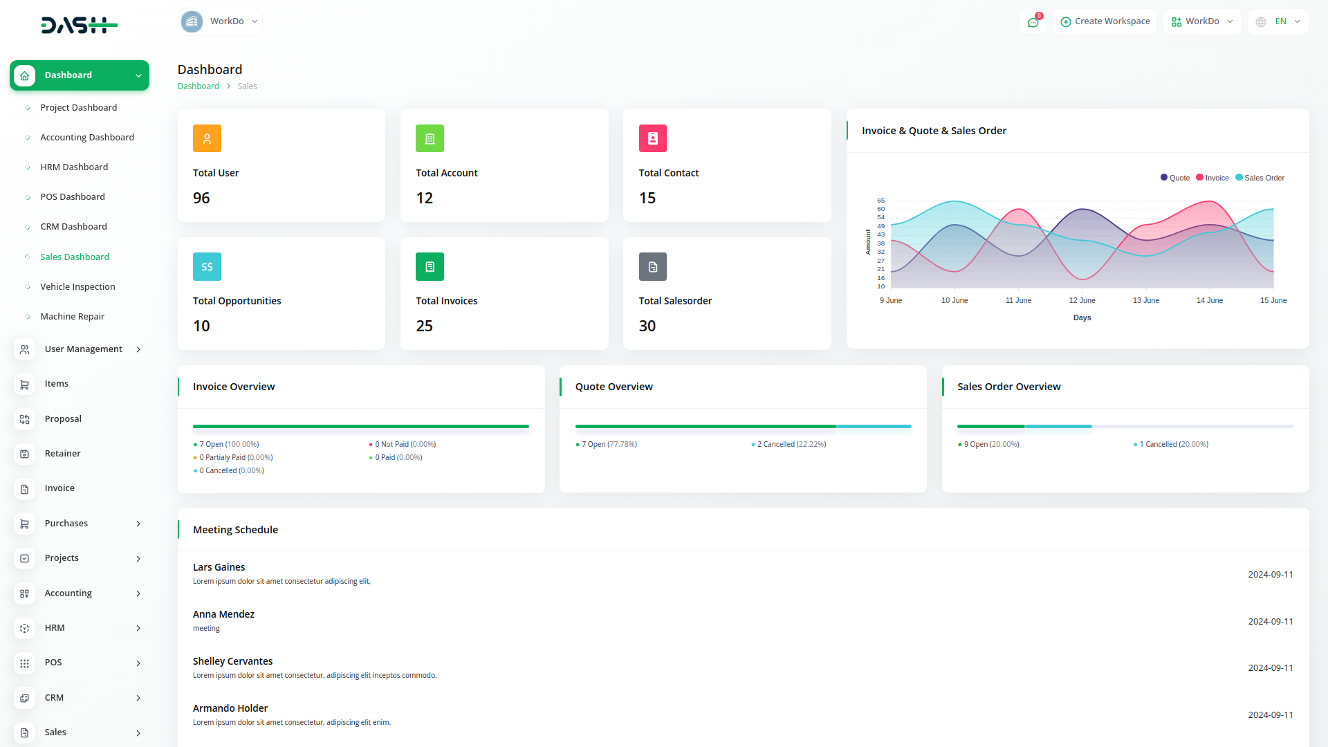 You can also find the individual overview of each of these elements broken down in percentages with their respective status. Additionally, know the top due tasks, meeting schedule, and monthly calls on this dashboard.